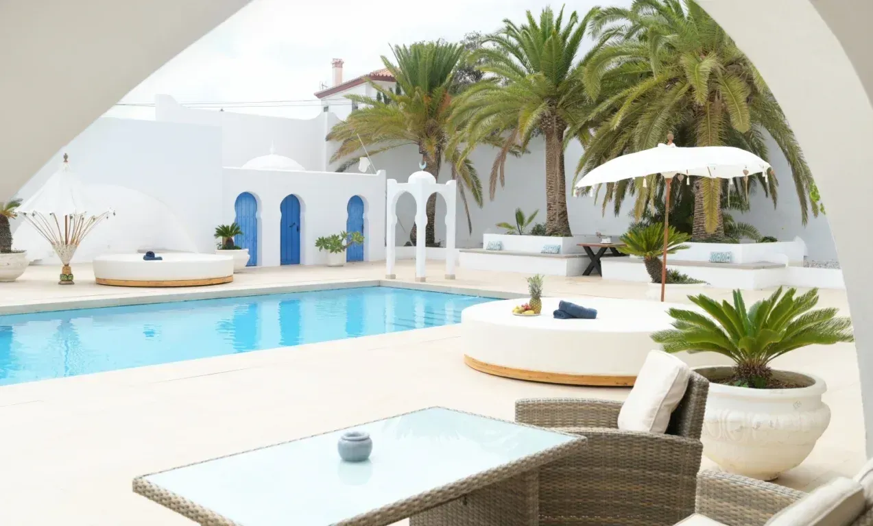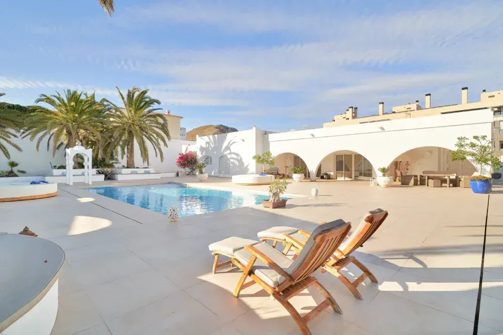 Lujoso espacio que rebosaba arte y magia en cada uno de sus arcos, donde se aprecia el cielo abierto de sol radiante y lluvia de estrellas en la noche, con una gran piscina privada salinizada sin químicos y vistas al mar Mediterraneo.